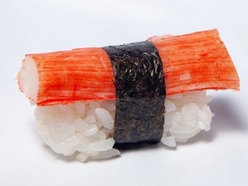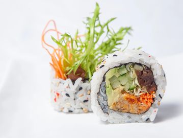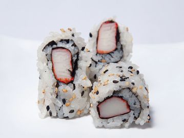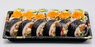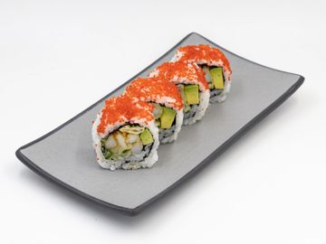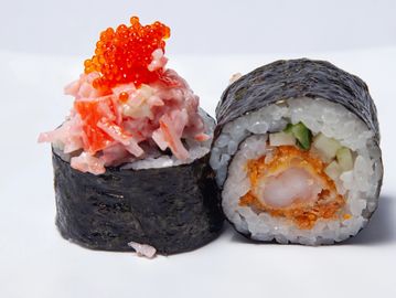 Crevette Tempura, Avocat, Concombre. Dessus: Goberge, Caviar, Mayo (Mix)