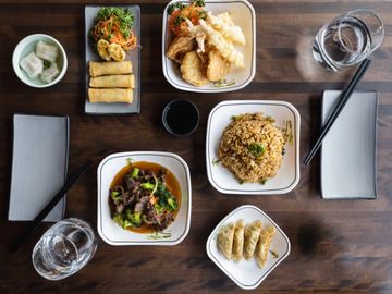 Soupe Wonton (1), Rouleau Impérial (2), Gyoza (3), Riz frit avec oeuf (1), Boeuf broccoli (1), Tempura crevette (2), Tempura patate douce (2)