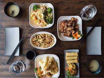 Soupe Miso (2), Rouleau Impérial (4), Tempura Crevette (2), Tempura Patate Douce (2), Boeuf Sésame (1), Poulet au beurre d'arachide (1), Nouilles Cantonais (1)