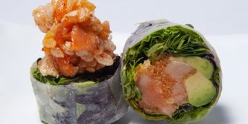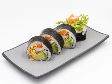 Saumon, Avocat, Mélange de printemps, Mayo épicé, Caviar rouge (Top: Saumon fumé, Oshinko, Tempura, Mayo épicé)