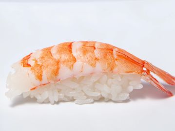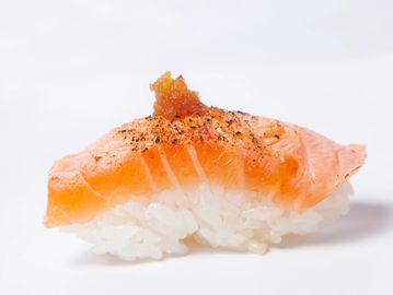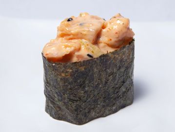 Crevette tempura et concombre (Top: saumon épicée et caviar)