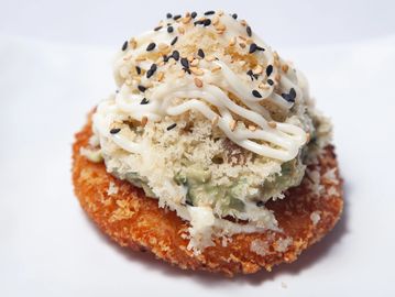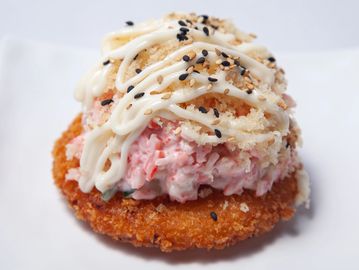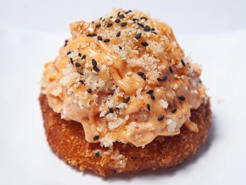 Galette au riz, Sous-marin, Mayo Épicé, Tempura, Caviar Rouge, Fromage